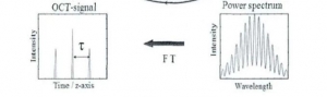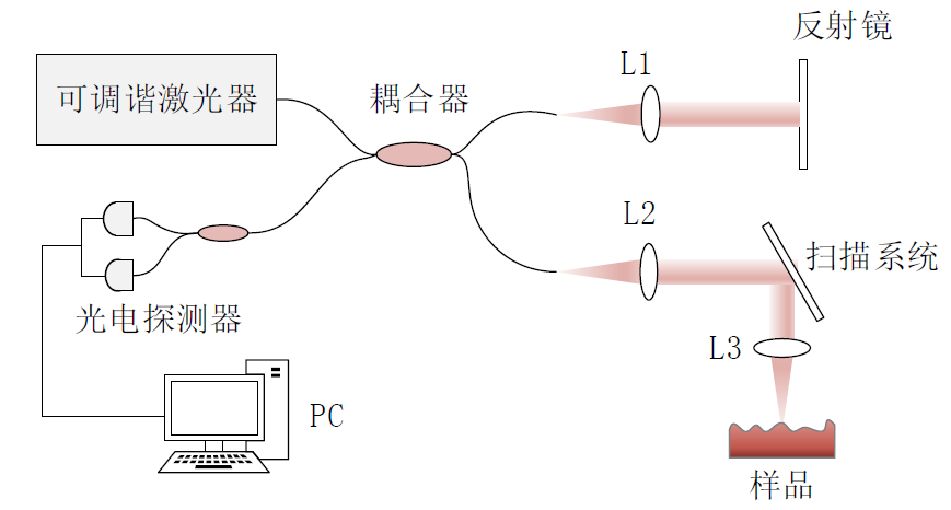 通過傳統(tǒng)的介入手段經(jīng)股動脈或者橈動脈將一次性使用血管內(nèi)成像導(dǎo)管推送至血管造影顯示狹窄的冠狀動脈血管段,利用一定量造影劑排空目標血管內(nèi)的血液,并維持大約3~5秒。然后成像主機控制成像導(dǎo)管的成像探頭在血管內(nèi)360°旋轉(zhuǎn)和回撤,通過成像段完成對血管的掃描;同時成像主機通過光源發(fā)射近紅外光、干涉儀記錄不同厚度血管的反射光、計算機重建反射光信號,形成血管內(nèi)斷層圖像。 血管內(nèi)斷層成像設(shè)備采用基于近紅外波段掃頻激光器的頻域OCT成像。成像主機中的耦合器將掃頻激光器(圖4中的可調(diào)諧激光器)發(fā)出不同波長的光分成兩束(參考光和樣品光),參考光通過透鏡 L1并被反射鏡反射并反向傳輸至耦合器;樣品光依次通過透鏡L2、掃描系統(tǒng)和透鏡L3入射至樣片點,L3接收被樣品反射的光并反向傳輸至耦合器;樣品光和參考光在耦合器干涉后通過光電探測器轉(zhuǎn)換成電信號傳輸至電腦(PC),光電探測器采集到x軸是波長,y軸是強度的干涉條紋,對該干涉條紋進行傅里葉變化即可得到該點處不同深度的反射信號。